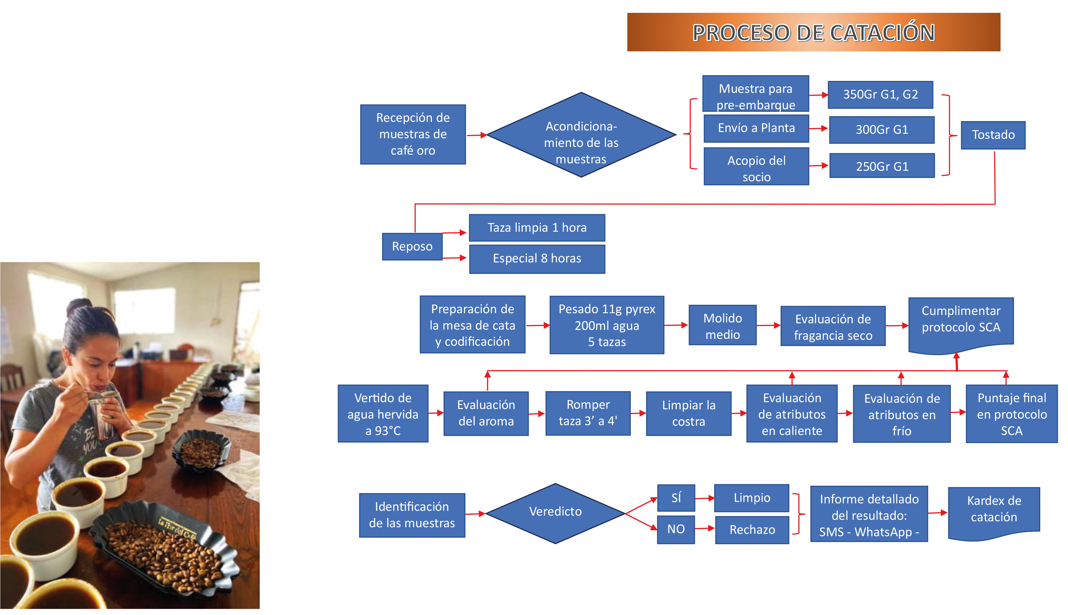 El proceso comienza con la recepción de la muestra de café verde. Esta muestra se prepara para ser evaluada y se acondiciona adecuadamente para el proceso de catación.